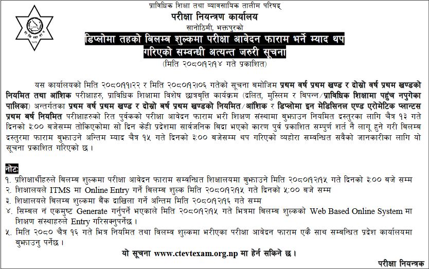 डिप्लोमा तह प्रथम वर्ष प्रथम खण्ड र दोश्रो वर्ष प्रथम खण्डको नियमित तथा आम्सिक परिक्षाको आव्दन फाराम भर्ने म्याद थपिएको बारे अत्यन्त जरुरी सुचना..