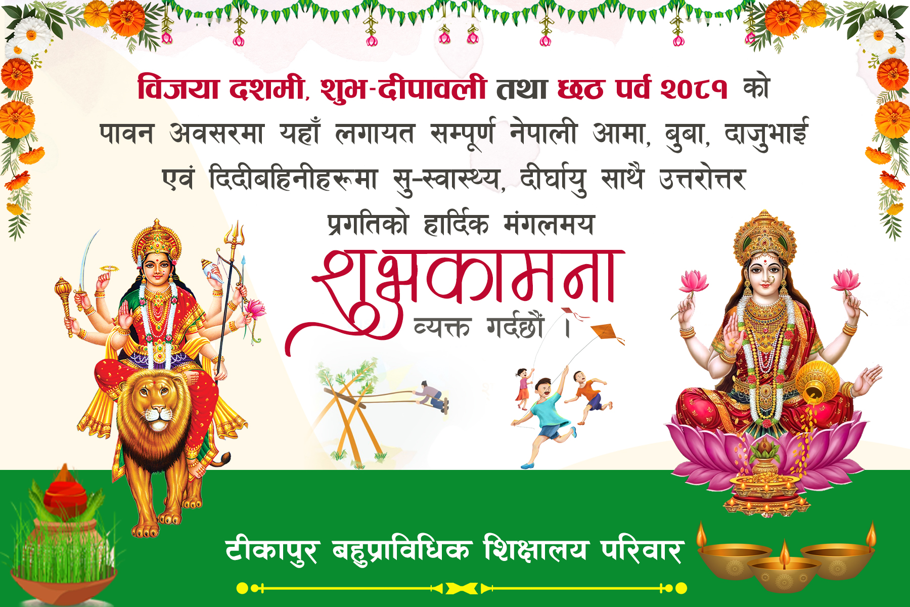 विजया दशमी, शुभ–दीपावली तथा छठ पर्व २०८१ को पावन अवसरमा यहाँ लगायत सम्पूर्ण नेपाली आमा, बुबा, दाजुभाई एवं दिदीबहिनीहरूमा सु–स्वास्थ्य, दीर्घायु साथै उत्तरोत्तर प्रगतिको हार्दिक मंगलमय शुभकामना