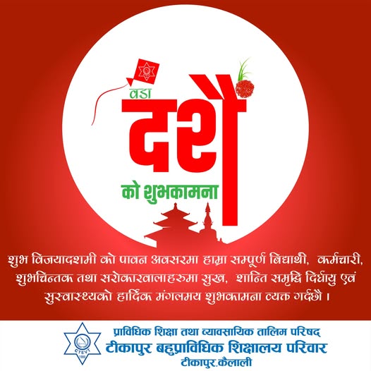 शुभ विजयादशमी को पावन अवसरमा हाम्रा सम्पूर्ण बिद्यार्थी, कर्मचारी, शुभचिन्तक तथा सरोकारवालाहरूमा सुख, शान्ति समृद्धि दिर्घायु एवं सुस्वास्थ्यको हार्दिक मंगलमय शुभकामना ।
