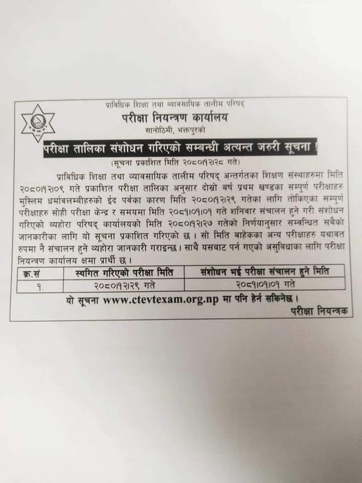 परीक्षा तालिका संशोधन गरिएको सूचना